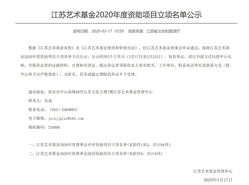 江苏省艺术基金2020年度资助项目立项名单公示:http://wlt.jiangsu.gov.cn/art/2020/3/17/art_699_9013805.html