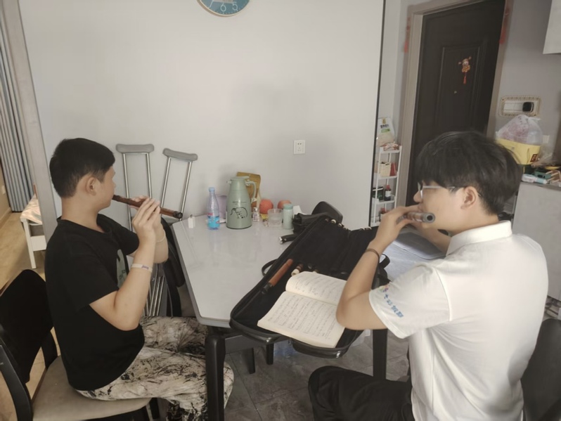 初次见面时,小迪对竹笛感到陌生又好奇。朱凌卿从他最熟悉的音阶和气息练习开始,鼓励他吹出第一个音符。“不着急,我们慢慢来”,成了课堂上最常听到的一句话。朱老师手把手地教他如何握笛、如何调整嘴唇、如何控制呼吸,每一个细微进步,都会换来真诚的肯定与笑容。